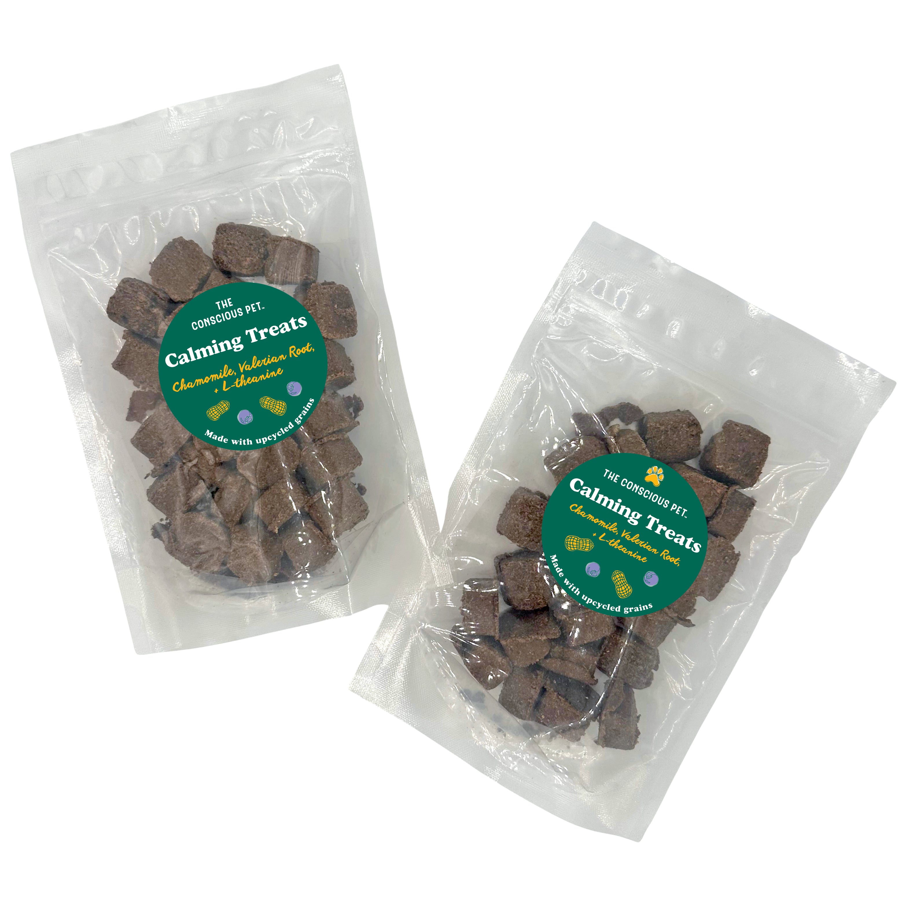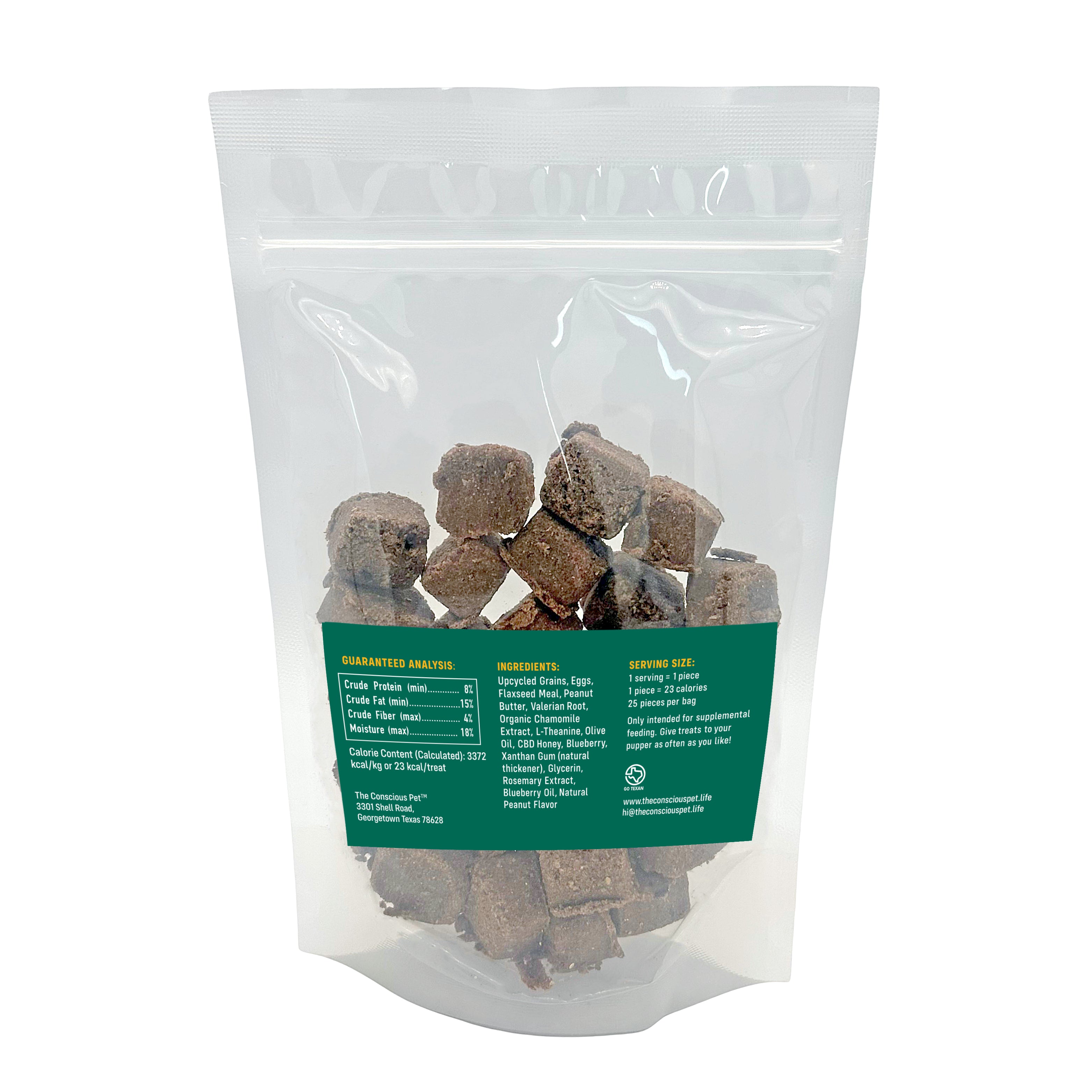 The Conscious Pet Calming Treats help ease stress naturally with a functional blend of chamomile, valerian root, L-theanine, and CBD honey.